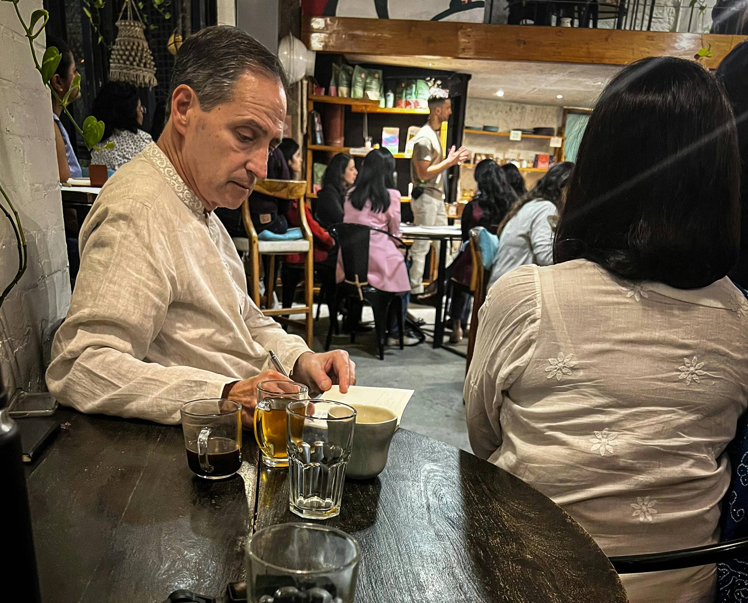 It’s a photo of my father, diligently taking notes during one of my talks at an event in India.