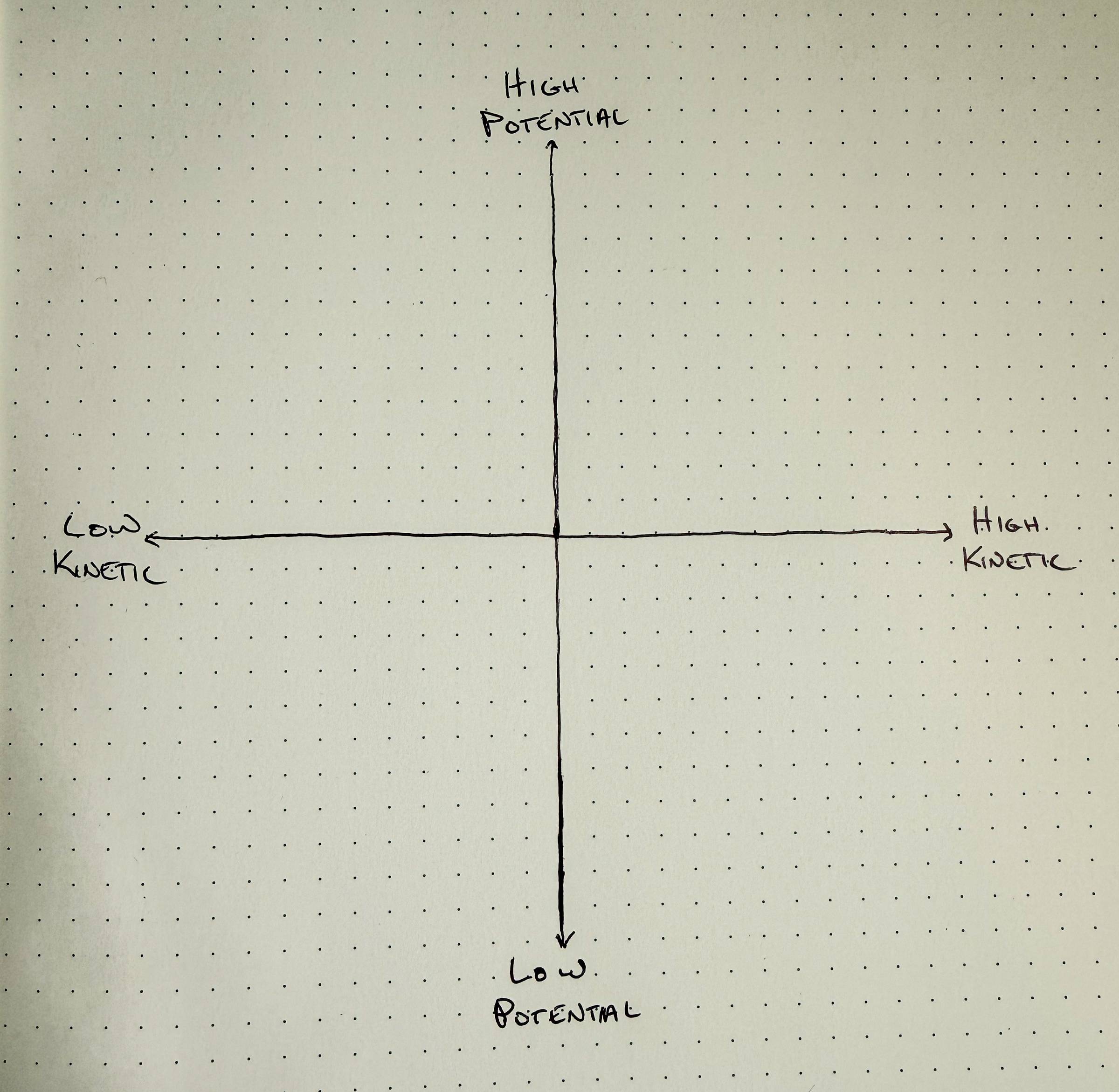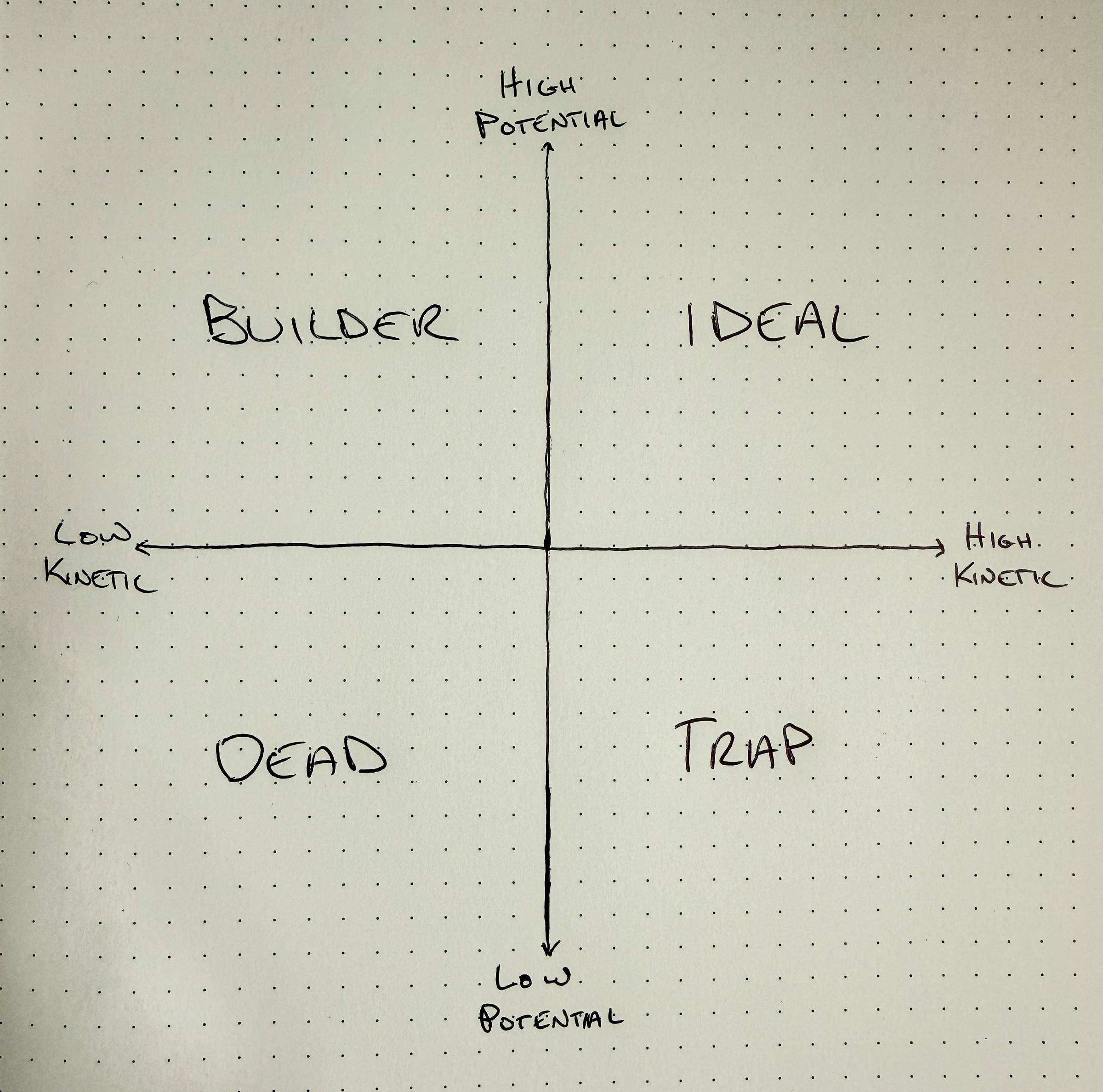 - High Potential, Low Kinetic: The Builder Zone. High accumulation of long-term, intangible assets, but low generation of present day value. It's the build for the future. The growth phase where you water your seeds before they break through the earth.