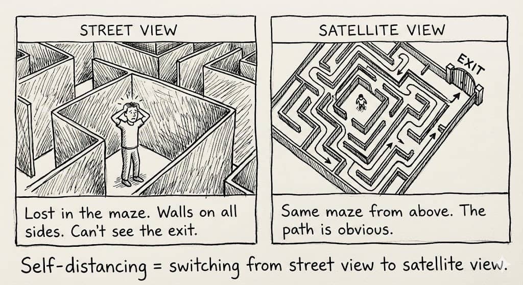 Self-distancing is shown to reduce emotional connection to a situation, lower the threat to your ego, expand your cognitive flexibility, and increase integrative thinking.