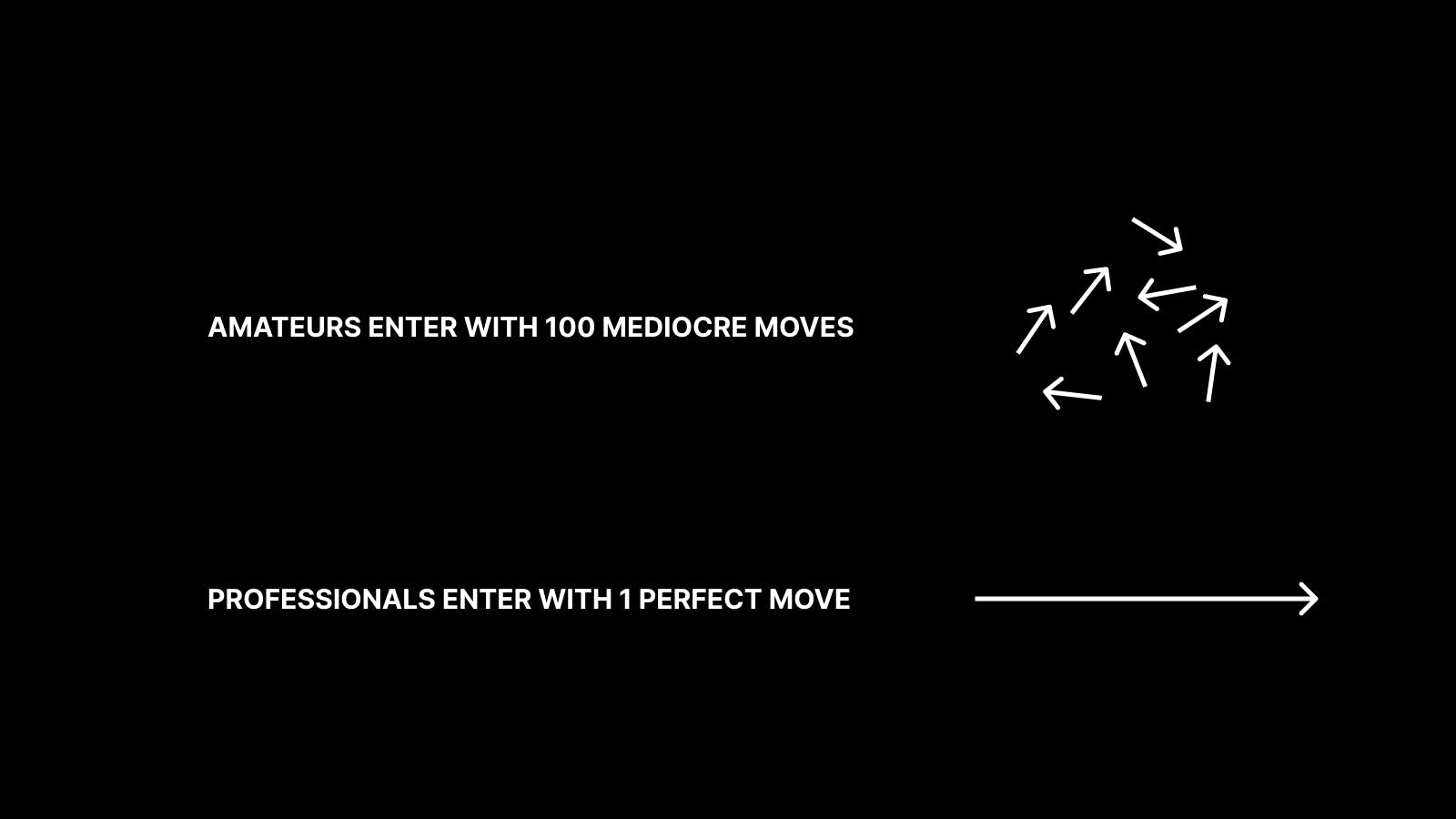 Amateurs enter with 100 mediocre moves, Professionals enter with 1 perfect move