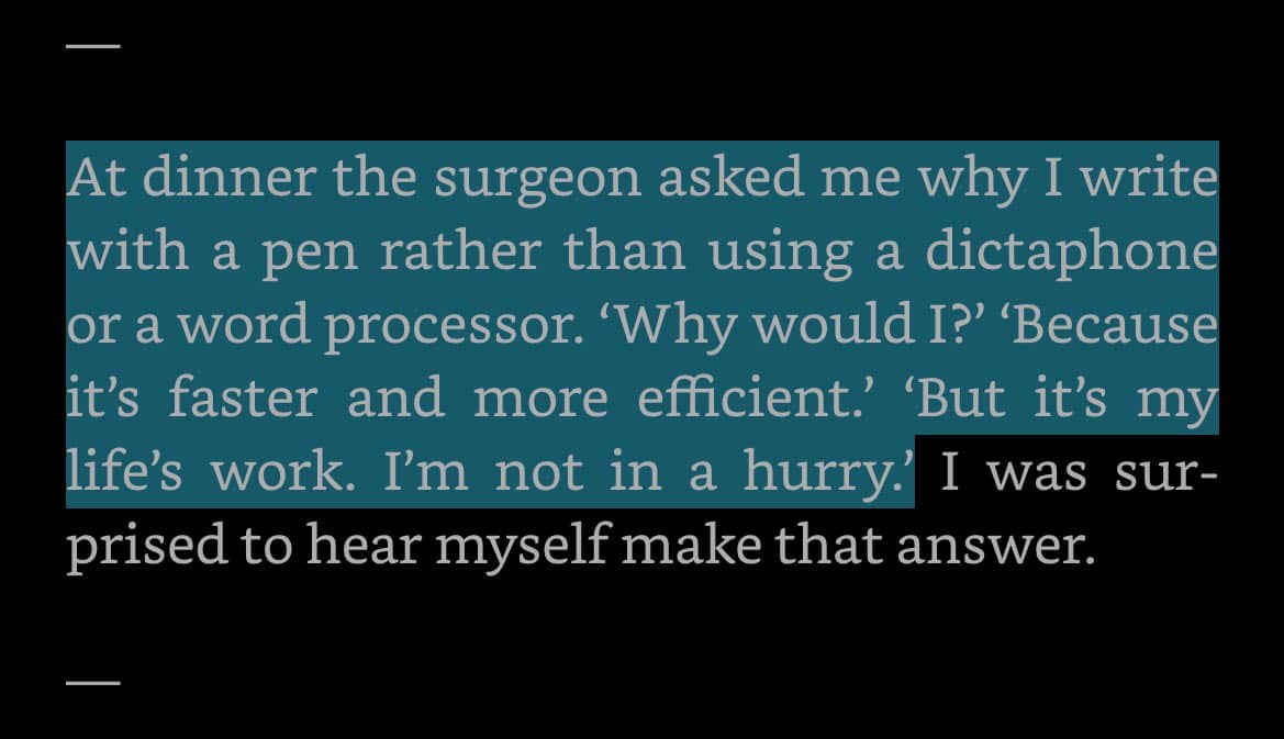 At dinner the surgeon asked me why I write with a pen rather than using a dictaphone or a word processor. 'Why would I?' 'Because it’s faster and more efficient.' 'But it’s my life’s work. I’m not in a hurry.'